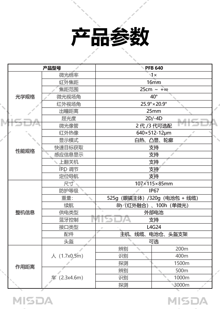 迈视达MISDA PFB640 是一款多功能双光融合热成像仪,采用红外、微光融合成像分辨率更高单体更易被识别,解决了单红外不能透过玻璃的缺陷,同时又有融合聚焦(画中画)功能,能对单点进行放大同时保持高清晰度。可用于夜晚昏暗无光、复杂场景和恶劣条件下的观察和目标搜寻。三代高清微光夜视,快速目标捕捉,功耗低、续航时间长。主要应用于工业、电子、医疗科研、安全缉私、边防观察、山林洞穴检测、安全执法、户外狩猎野外探险、侦查搜救等多个领域。