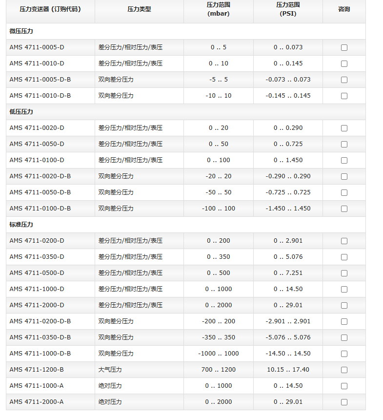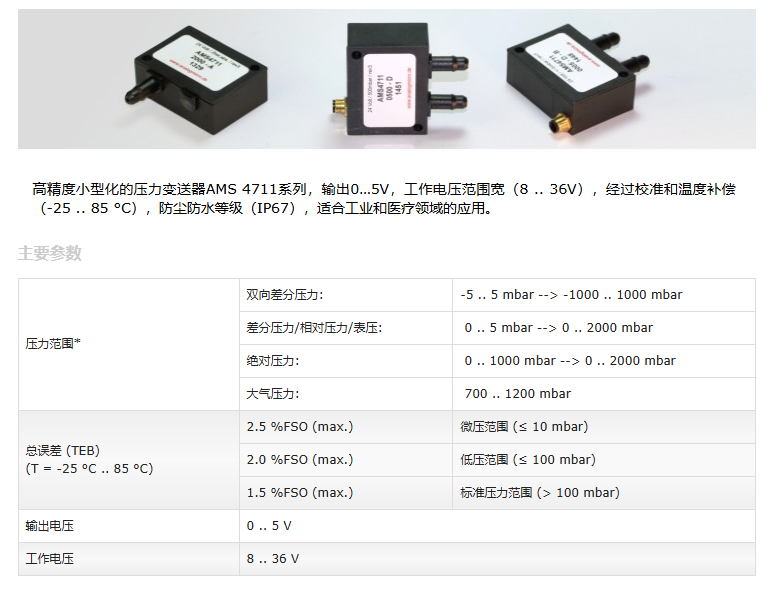 高精度小型化的压力变送器AMS 4711系列,输出0…5V,工作电压范围宽(8 .. 36V),经过校准和温度补偿(-25 .. 85 °C),防尘防水等级(IP67),适合工业和医疗领域的应用。