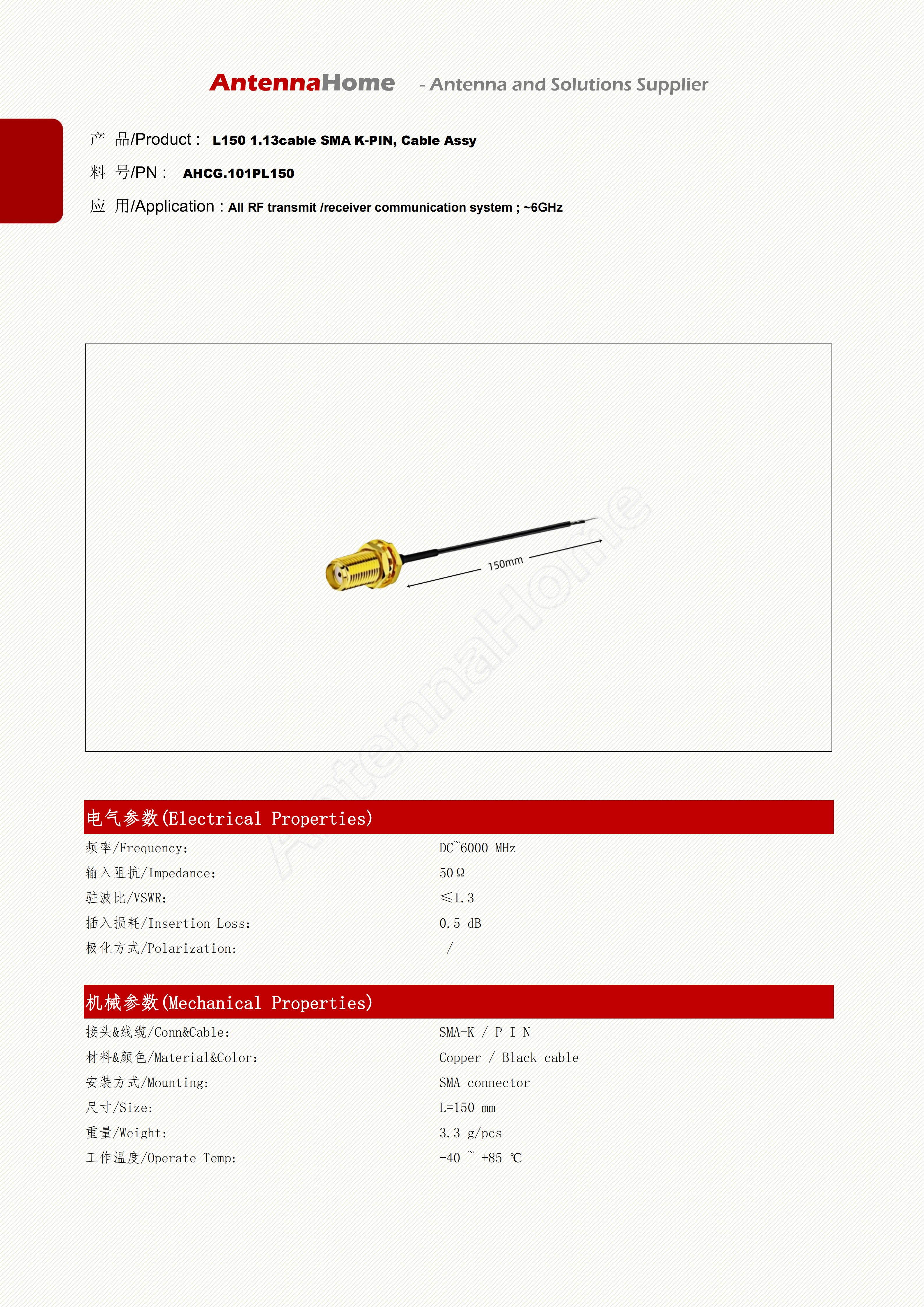 Datasheet : http://docs.antennahome.com/ant/AHCG.101PL150.pdf