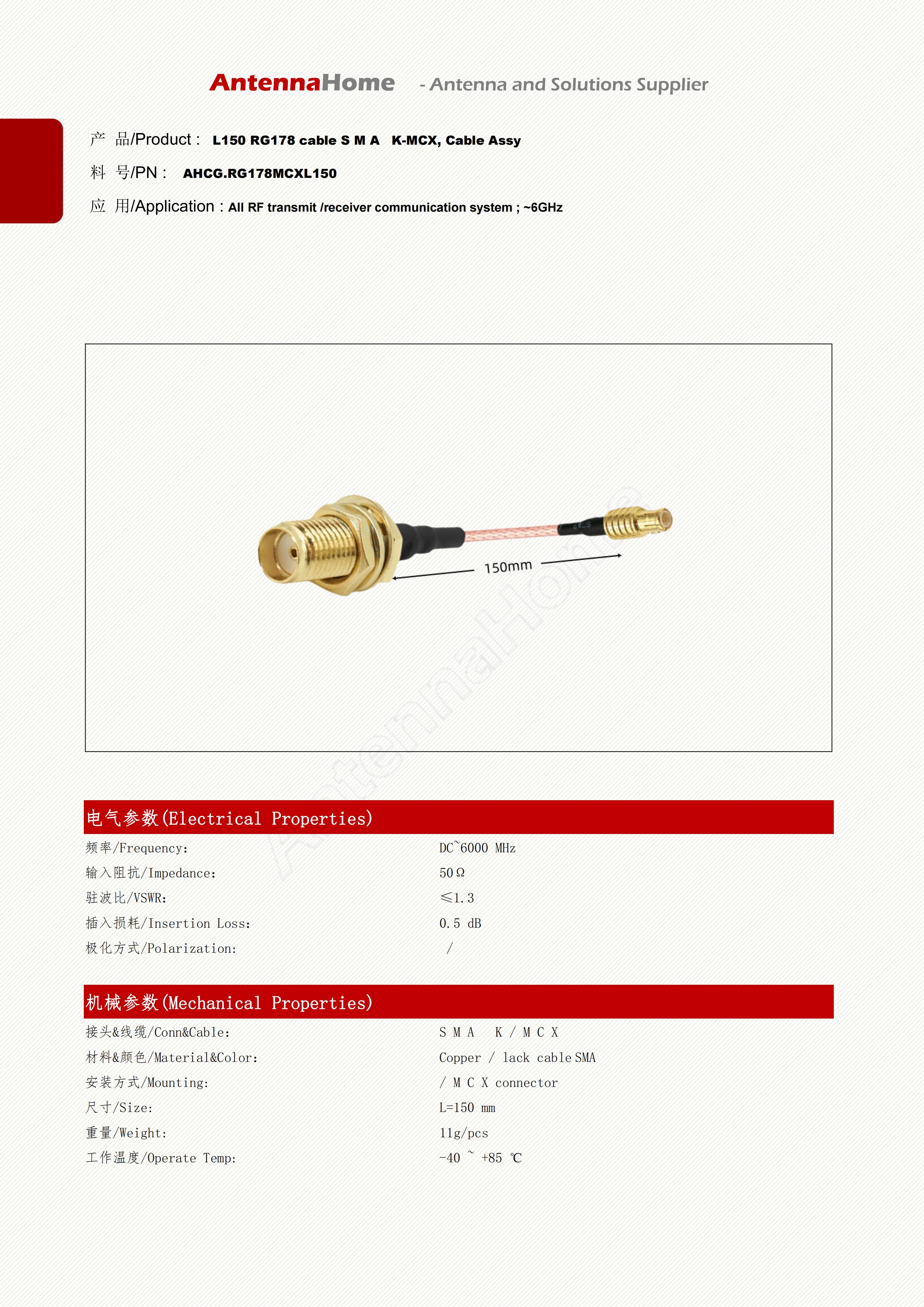 Datasheet : http://docs.antennahome.com/ant/AHCG.RG178MCXL150.pdf