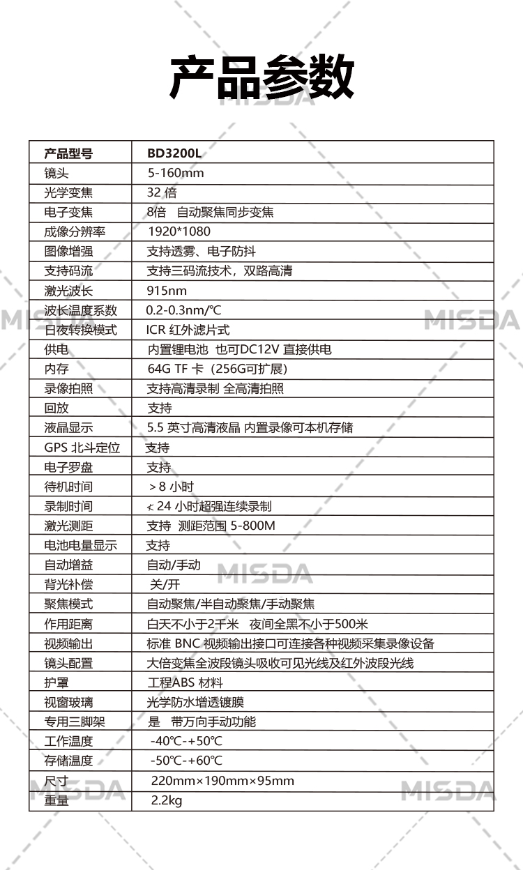 激光测距:支持,测距范围 5-800M
