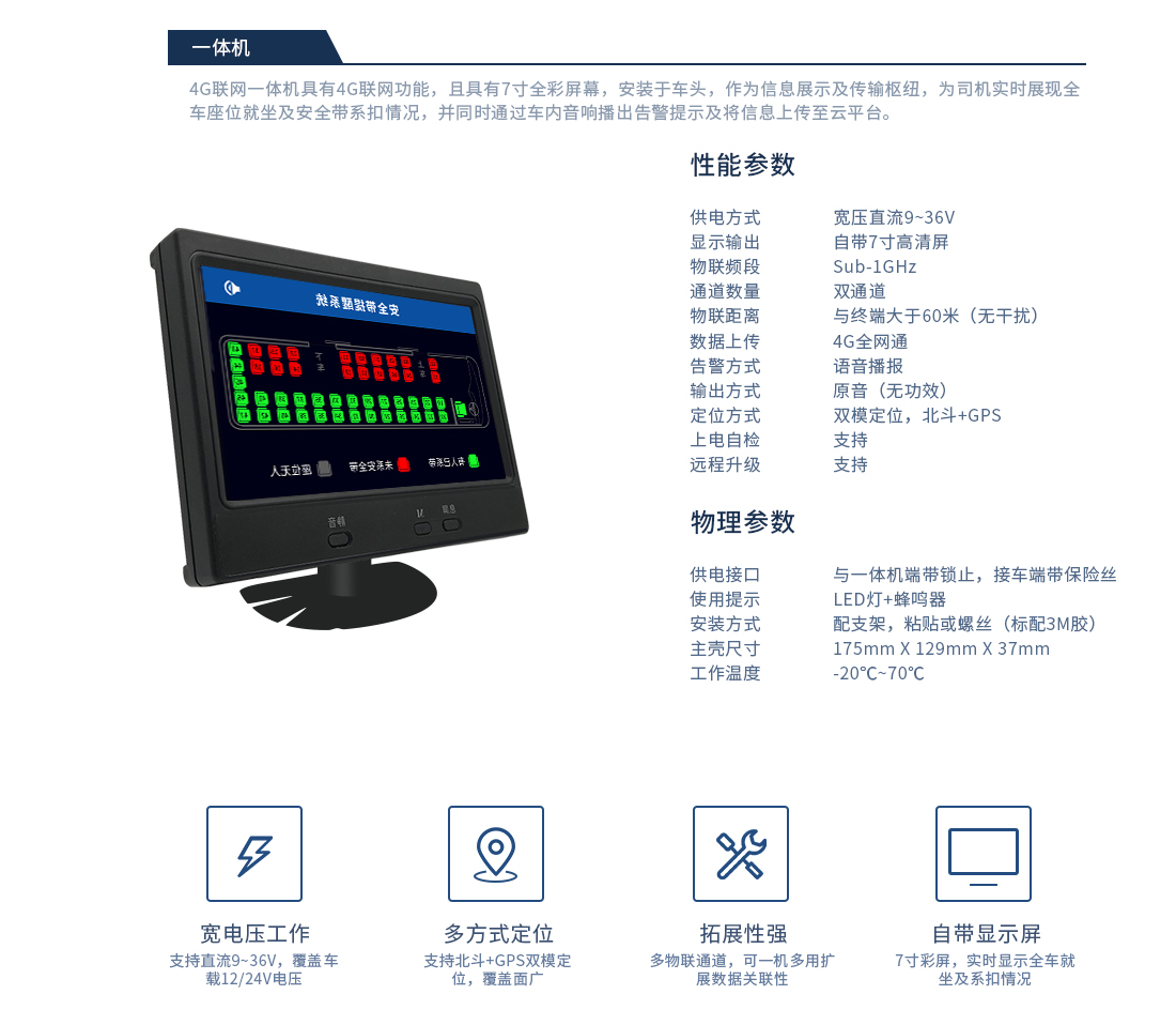 4G联网一体机具有4G联网功能,且具有7寸全彩屏幕,安装于车头,作为信息展示及传输枢纽,为司机实时展现全车座位就坐及安全带系扣情况,并同时通过车内音响播出告警提示及将信息上传至云平台。